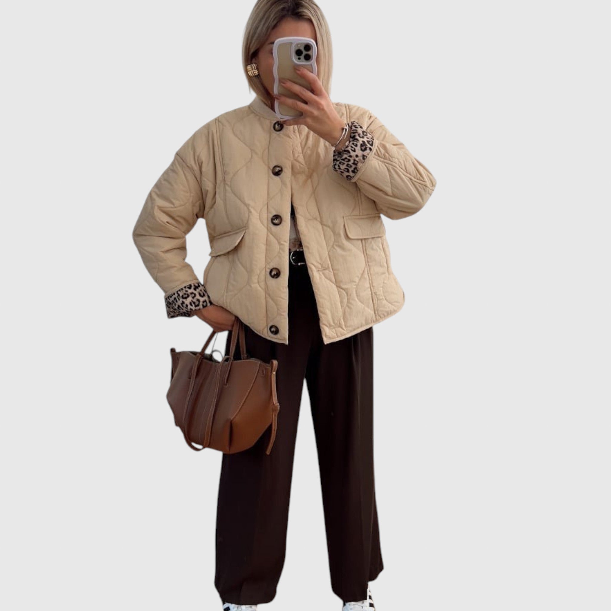 • Stylová leopardí podšívka – Leopardí vzor dodává nádech odvážné elegance, diskrétně viditelný na ohrnutých rukávech nebo výstřihu.